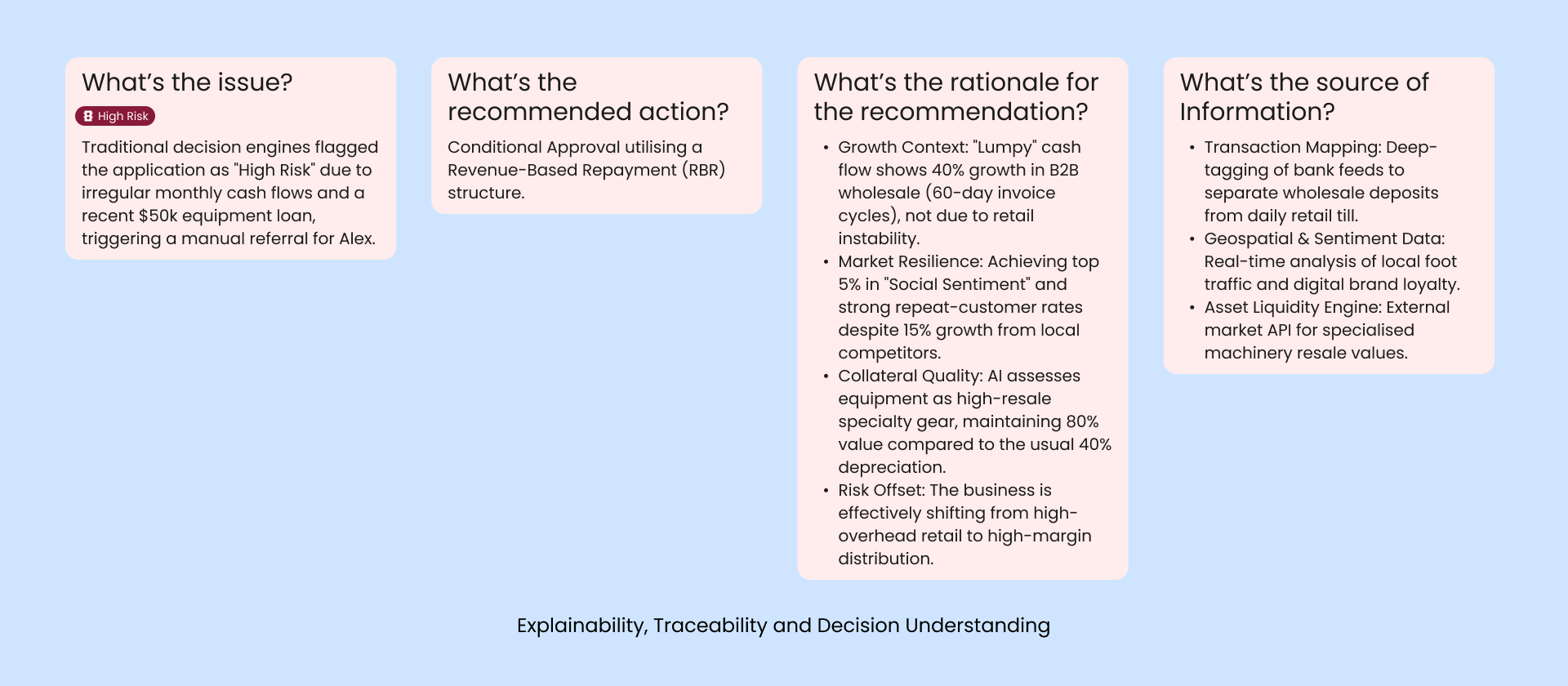 Imagine an underwriter named Alex, assessing a complex loan for a roastery looking to open a second location. The system has flagged the loan proposal as “referred”, meaning that it’s sitting in a grey area where automated rules can’t provide a clear answer. Alex’s task is to assess the affordability of the proposal for this potential borrower and the likelihood that they will repay the loan, while identifying any potential fraud. This could involve scanning months of unstructured data and switching between systems to identify seasonal revenue patterns and hidden debt, and reconciling irregular cash flows from different sources while ensuring the decision is unbiased. All this while managing comms with the introducer and the clock ticking on a tight SLA.